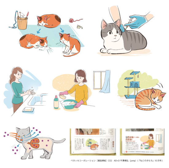 『愛猫との防災シーン、このグッズが役立つ!』のイラストを担当しました。