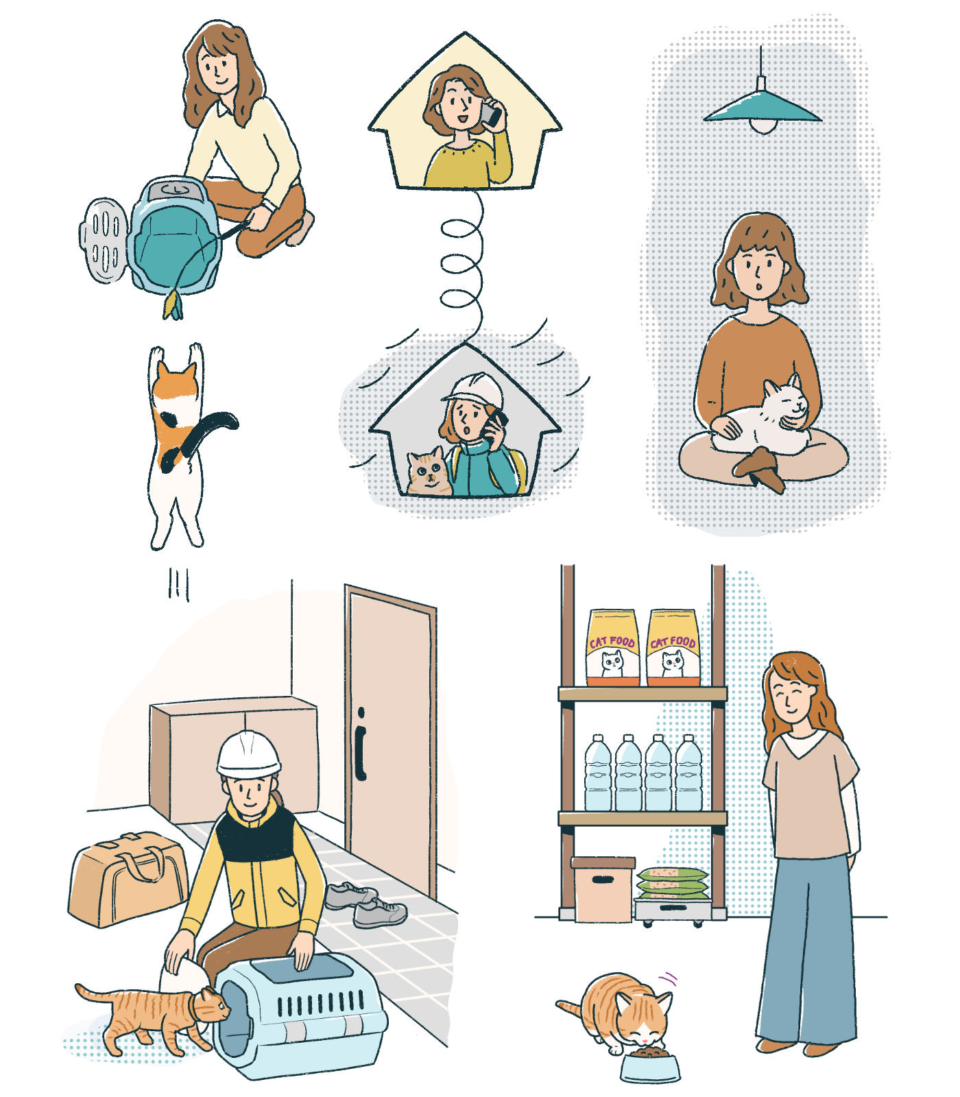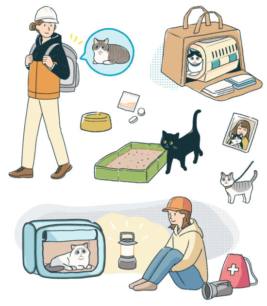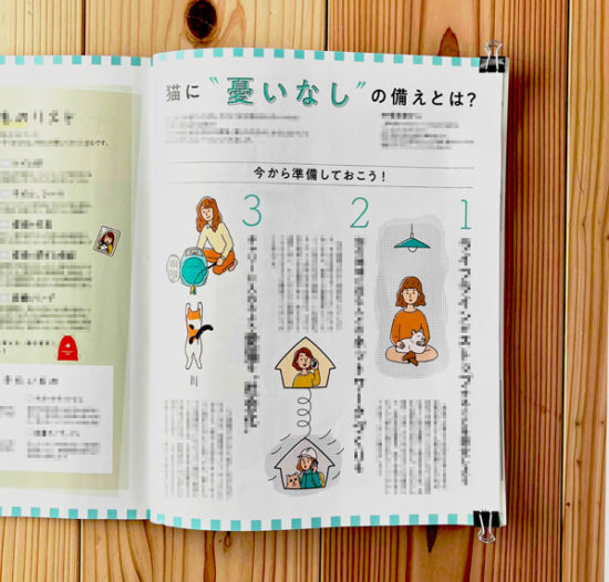 『愛猫との防災シーン、このグッズが役立つ!』のイラストを担当しました。